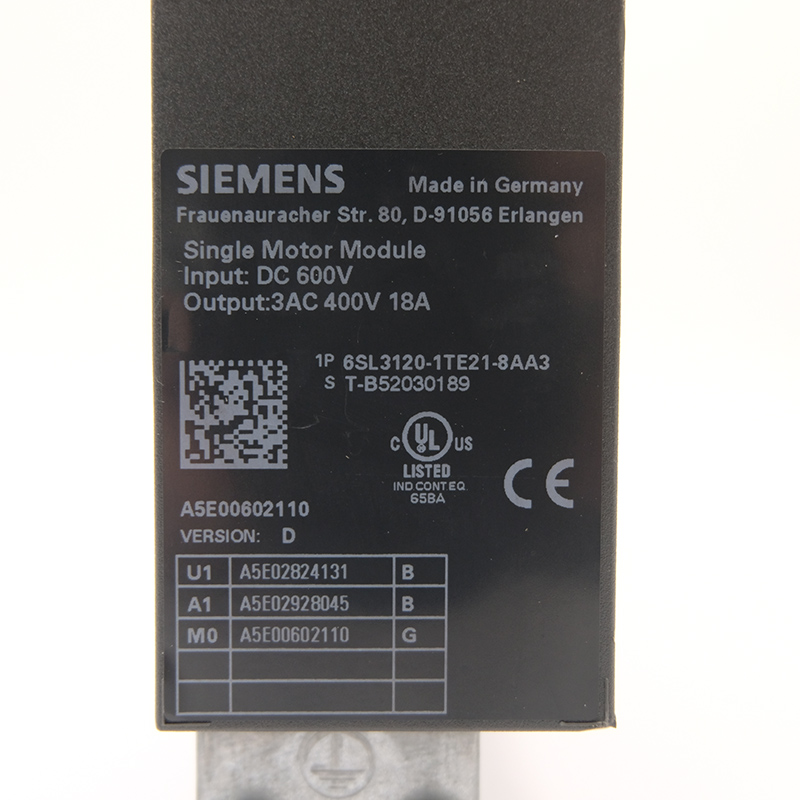 El 6SL3120-1TE21-8AA3 es un Módulo de motor único tamaño libro dentro de siemens SINÁMICA S120 sistema de accionamiento. Funciona como un Unidad de alimentación activa/inversora para controlar directamente un servomotor o un motor de inducción. El módulo se comunica con el controlador del sistema (por ejemplo, CU320-2) a través de la interfaz Drive-CLiQ para lograr un control servo o vectorial de alto rendimiento. Es adecuado para aplicaciones de control de movimiento que exigen alta respuesta dinámica y precisión, como máquinas herramienta, imprentas y equipos de embalaje.