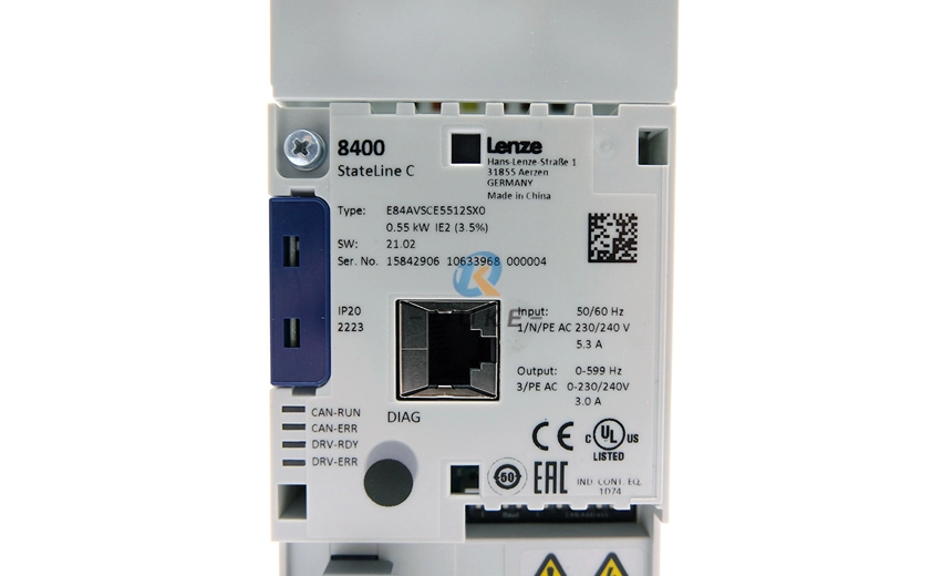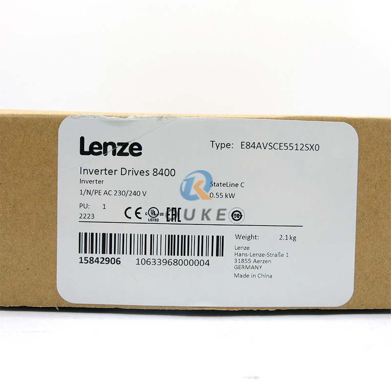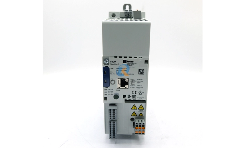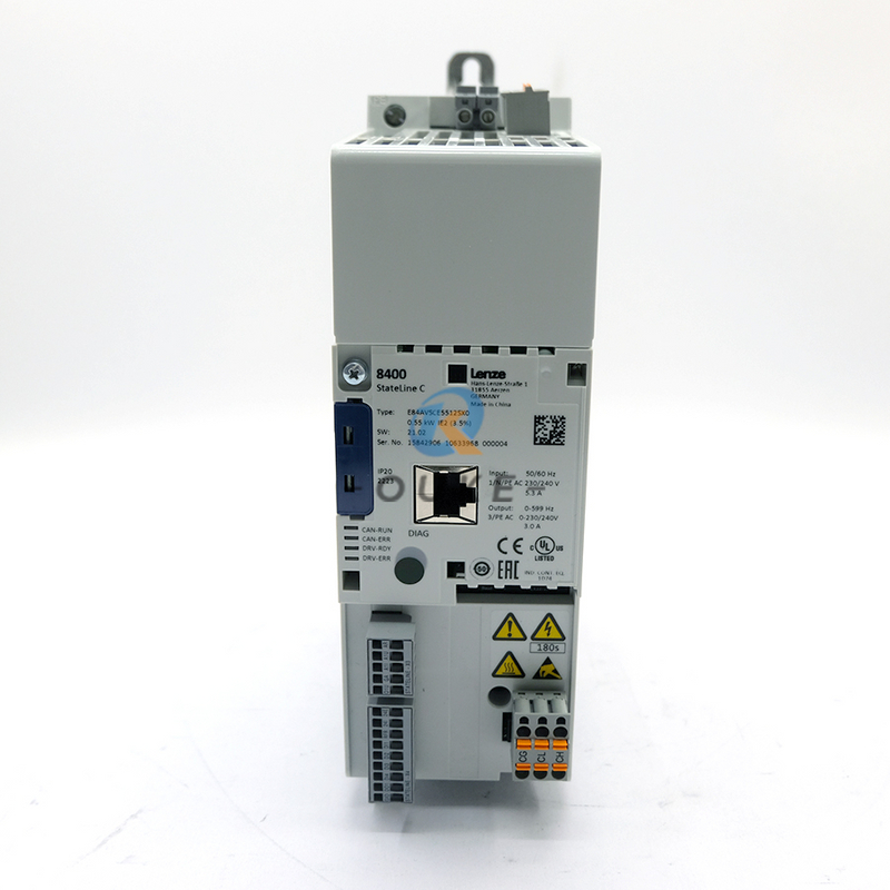The Lenze E84AVSCE5512SX0 belongs to the 8400 StateLine C series of inverter drives, designed to “ensure movement in complex applications” such as transverse material handling, palletizers, extruders, and filling systems. It operates from a 1/N/PE 230/240V AC mains (50/60Hz) and provides 0.55kW rated motor power with 3.0A rated output current and 0–599Hz output frequency range, enabling both standard and high‑speed operation for three‑phase motors.