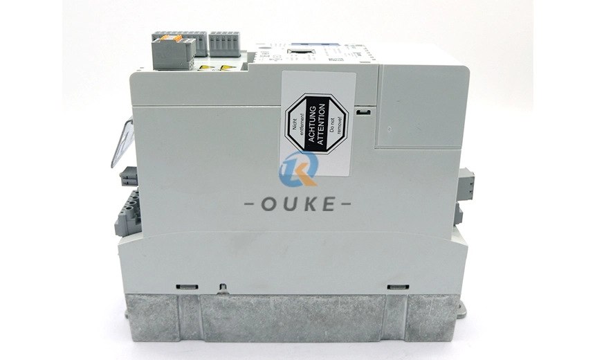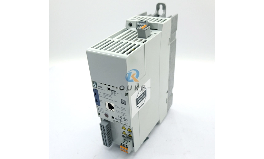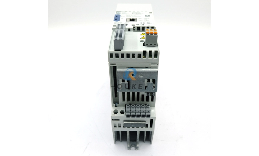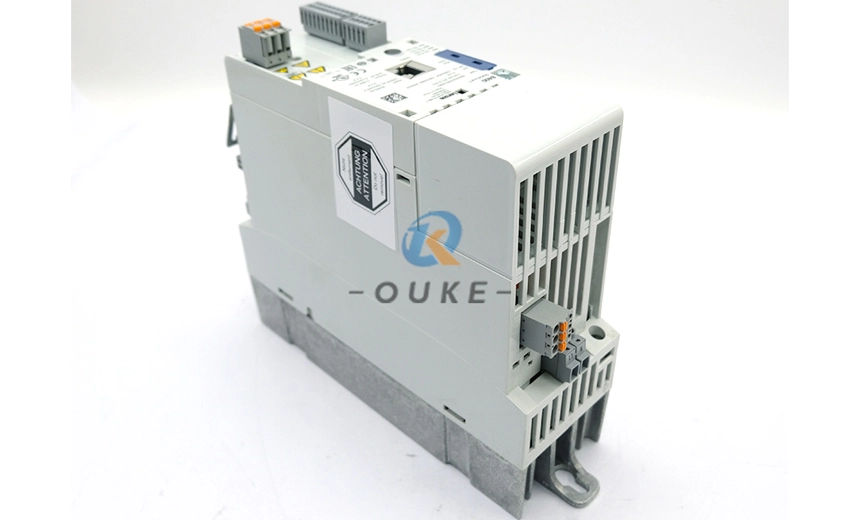 The drive features start/stop terminals, 1 analog input and 1 analog output (0–10V), plus 4 freely programmable digital inputs and 1 digital output/relay, allowing flexible integration with PLCs and field I/O. Communication options include on‑board CANopen and optional EtherCAT, EtherNet/IP, POWERLINK, PROFIBUS, or PROFINET modules, making it suitable for centralized or decentralized control architectures. Advanced functions such as integrated brake management, the “VFC eco” energy‑saving mode, and STO (Safe Torque Off) safety function improve energy efficiency, motor control performance, and machine safety. The compact IP20 installation design (approx. 26.5 × 26 × 8cm, 2.1–2.36kg) simplifies panel mounting and wiring in OEM machinery.